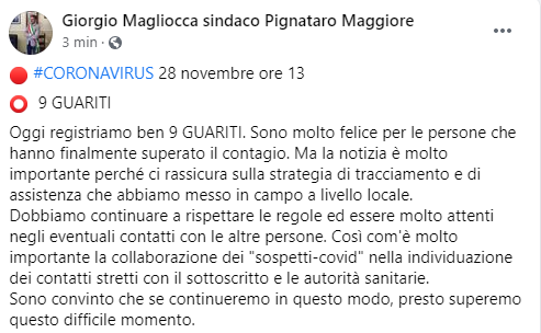Lo apprendiamo dalla pagina Facebook del Sindaco di Pignataro Maggiore Giorgio Magliocca