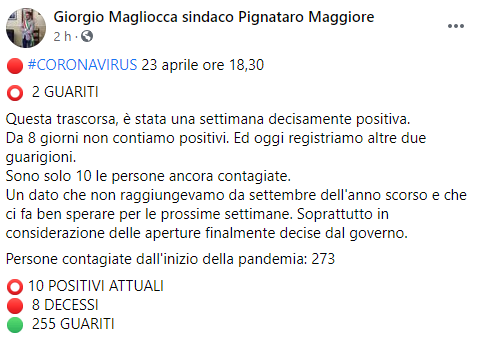 Questo il post pubblicato sulla sua pagina Facebook dal Sindaco di Pignataro Maggiore Giorgio Magliocca: "Coronavirus. 23 aprile ore 18,30. 2 GUARITI. Questa trascorsa, è stata una settimana decisamente positiva. Da 8 giorni - si legge nel post - non contiamo positivi. Ed oggi registriamo altre due guarigioni. Sono solo 10 le persone ancora contagiate. Un dato che non raggiungevamo da settembre dell'anno scorso e che ci fa ben sperare per le prossime settimane. Soprattutto - si legge ancora nel post - in considerazione delle aperture finalmente decise dal governo. Persone contagiate dall'inizio della pandemia: 273 10 POSITIVI ATTUALI 8 DECESSI 255 GUARITI".