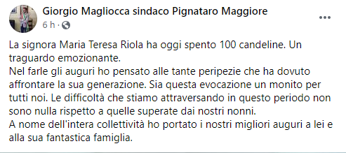 Questo il post pubblicato sulla sua pagina Facebook dal Sindaco di Pignataro Maggiore Giorgio Magliocca