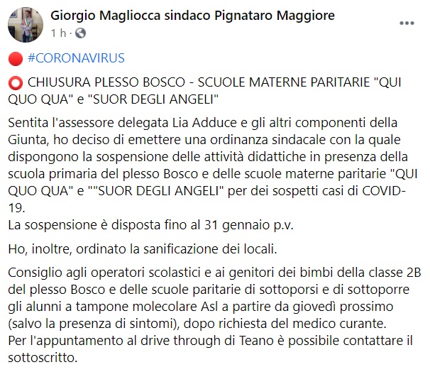 Sentita l'assessore delegata Lia Adduce e gli altri componenti della Giunta, ho deciso di emettere una ordinanza sindacale con la quale dispongono la sospensione delle attività didattiche in presenza della scuola primaria del plesso Bosco e delle scuole materne paritarie "QUI QUO QUA" e ""SUOR DEGLI ANGELI" per- si legge nella nota- dei sospetti casi di COVID-19. La sospensione è disposta fino al 31 gennaio p.v. Ho, inoltre, ordinato la sanificazione dei locali. Consiglio agli operatori scolastici e ai genitori dei bimbi della classe 2B del plesso Bosco e delle scuole paritarie di sottoporsi e di sottoporre- si legge nella nota- gli alunni a tampone molecolare Asl a partire da giovedì prossimo (salvo la presenza di sintomi), dopo richiesta del medico curante. Per l'appuntamento al drive through di Teano è possibile contattare il sottoscritto."