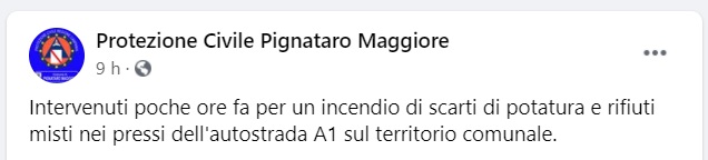 Questo quanto apprendiamo dalla pagina facebook della Prot. Civile di Pignataro Maggiore: "Intervenuti poche ore fa per un incendio di scarti di potatura e rifiuti misti - si legge nella nota - nei pressi dell'autostrada A1 sul territorio comunale."