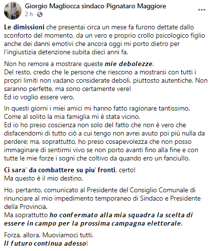 Questo il post pubblicato sulla sua pagina Facebook dal Sindaco di Pignataro Maggiore e Presidente della Provincia di Terra di Lavoro Giorgio Magliocca: "Le dimissioni che presentai circa un mese fa furono dettate dallo sconforto del momento, da un vero e proprio crollo psicologico figlio anche dei danni emotivi che ancora oggi mi porto dietro per l'ingiustizia detenzione subita dieci anni fa. Non ho remore a mostrare queste mie debolezze. Del resto - si legge nel post - credo che le persone che riescono a mostrarsi con tutti i propri limiti non vadano considerate deboli, piuttosto autentiche. Non saranno perfette, ma sono certamente vere! Ed io voglio essere vero. In questi giorni i miei amici mi hanno fatto ragionare tantissimo. Come al solito la mia famiglia mi è stata vicino. Ed io - prosegue il post - ho preso coscienza non solo del fatto che non è vero che disfacendomi di tutto ciò a cui tengo non avrei avuto poi più nulla da perdere; ma, soprattutto, ho preso cosapevolezza che non posso immaginare di sentirmi vivo se non porto avanti fino alla fine e con tutte le mie forze i sogni che coltivo da quando ero un fanciullo. Ci sarà da combattere su più fronti, certo! Ma questo è il mio destino. Ho, pertanto, comunicato al Presidente del Consiglio Comunale di rinunciare al mio impedimento temporaneo di Sindaco e Presidente della Provincia. Ma soprattutto - si legge nel post - ho confermato alla mia squadra la scelta di essere in campo per la prossima campagna elettorale. Forza, allora - conclude il post - Muoviamoci tutti. Il futuro continua adesso!".