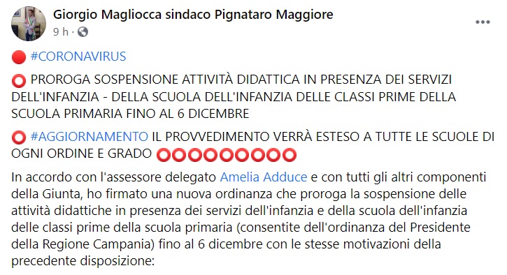 Questo quanto pubblicato sulla pagina facebook del Sindaco Magliocca: