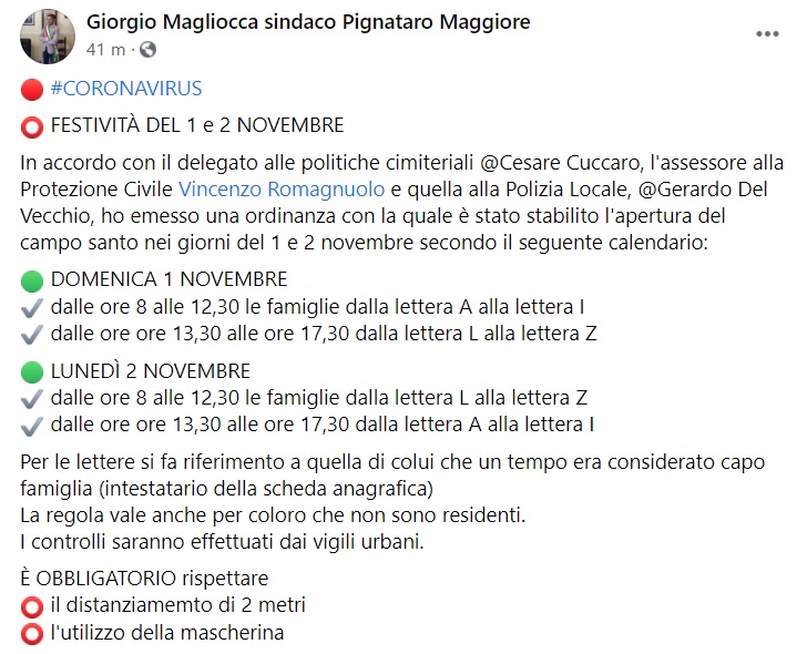 Questo quanto apprendiamo dalla pagina facebook del Sindaco Magliocca: