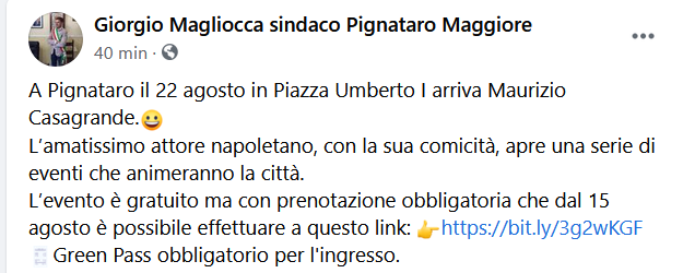 Questo il post pubblicato da Giorgio Magliocca, sindaco di Pignataro Maggiore, sulla sua pagina Facebook: "A Pignataro il 22 agosto in Piazza Umberto I arriva Maurizio Casagrande. L’amatissimo attore napoletano, con la sua comicità, apre una serie di eventi che animeranno la città. L’evento è gratuito - si legge nel post - ma con prenotazione obbligatoria che dal 15 agosto è possibile effettuare a questo link: CLICCA QUI Green Pass obbligatorio per l'ingresso".