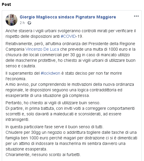 "Anche stasera i vigili urbani svolgeranno controlli mirati per verificare il rispetto delle disposizioni anti COVID-19. Relativamente, però, all'ultima ordinanza del Presidente della Regione Campania Vincenzo De Luca che prevede una multa di 1000 euro e la chiusura dei locali commerciali per 30 gg in caso di mancato utilizzo delle mascherine protettive, ho chiesto ai vigili urbani di utilizzare buon senso e cautela. Il superamento del lock down è stato deciso per non far morire l'economia. A mio avviso, pur comprendendo le motivazioni della nuova ordinanza regionale, le disposizioni seguono una logica contraddittoria ed esasperante di una situazione già complessa. Pertanto, ho chiesto ai vigili di utilizzare buin senso. Di partire, in prima battuta, con inviti volti a correggere comportamenti scorretti e, solo davanti a maleducati e sconsiderati, ad essere intransigenti. In questa particolare fase serve il buon senso di tutti. Chiudere per 30gg un negozio o addirittura togliere dalle tasche di una famiglia ben 1000 euro perché magari per distrazione ci si è dimenticati per un attimo di indossare la mascherina mi sembra davvero una situazione esasperata. Chiaramente, nessuno sconto ai furbetti."