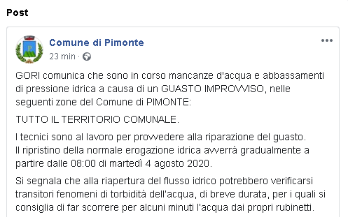 "GORI comunica che sono in corso mancanze d'acqua e abbassamenti di pressione idrica a causa di un GUASTO IMPROVVISO, nelle seguenti zone del Comune di PIMONTE: TUTTO IL TERRITORIO COMUNALE. I tecnici sono al lavoro per provvedere alla riparazione del guasto. Il ripristino della normale erogazione idrica avverrà gradualmente a partire dalle 08:00 di martedì 4 agosto 2020. Si segnala che alla riapertura del flusso idrico potrebbero verificarsi transitori fenomeni di torbidità dell’acqua, di breve durata, per i quali si consiglia di far scorrere per alcuni minuti l’acqua dai propri rubinetti."
