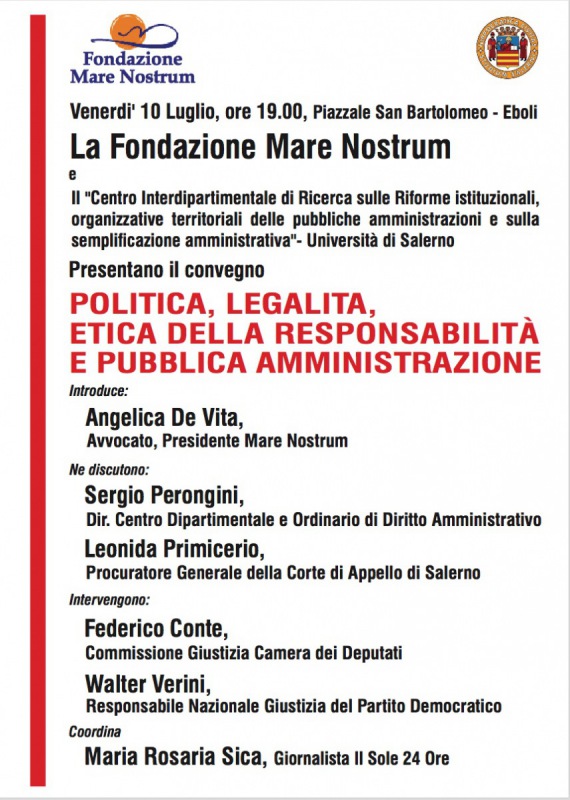 Politica, legalità, etica della responsabilità e pubblica amministrazione. Se ne discuterà venerdì 10 luglio, alle ore 19, a Eboli. Appuntamento nel piazzale San Bartolomeo per un convegno organizzato dalla Fondazione Mare Nostrum e dal Centro interdipartimentale di ricerca sulle Riforme istituzionali dell'Università di Salerno.-spiega la nota-Introdurrà i lavori l’avvocato Angelica De Vita, presidente di Mare nostrum. A discutere ci saranno Sergio Perongini, ordinario di Diritto amministrativo e direttore del Centro dipartimentale, e il procuratore generale della Corte di Appello di Salerno, Leonida Primicerio. Interverranno i deputati Federico Conte, Leu, e Walter Verini, Pd. Coordinerà la giornalista Maria Rosaria Sica."