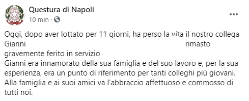 Questo parte del post pubblicato sulla pagina Facebook Questura di Napoli: "Oggi, dopo aver lottato per 11 giorni, ha perso la vita il nostro collega Gianni (...) rimasto gravemente ferito in servizio (...). Gianni era innamorato della sua famiglia e del suo lavoro e, per la sua esperienza, era un punto di riferimento per tanti colleghi più giovani. Alla famiglia - conclude il post - e ai suoi amici va l'abbraccio affettuoso e commosso di tutti noi".