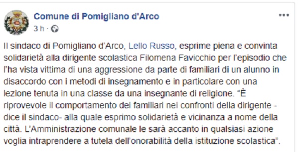 Questo il post pubblicato sulla pagina fb ufficiale del Comune di Pomigliano d'Arco.
