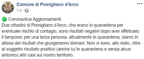 Questo quanto appreso dalla pagina facebook del Comune di Pomigliano d'Arco: