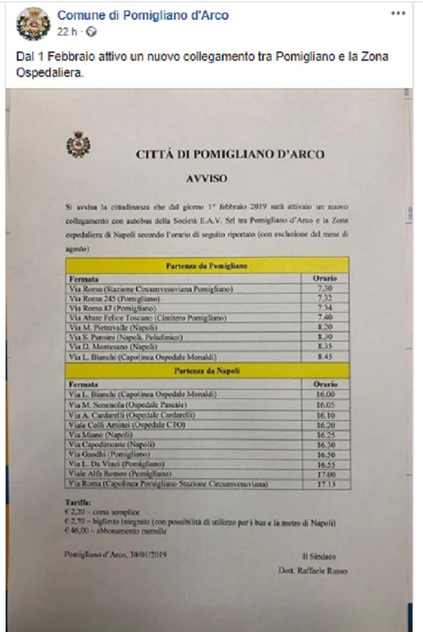 Questo il post pubblicato sulla pagina fb ufficiale del Comune di Pomigliano d'Arco