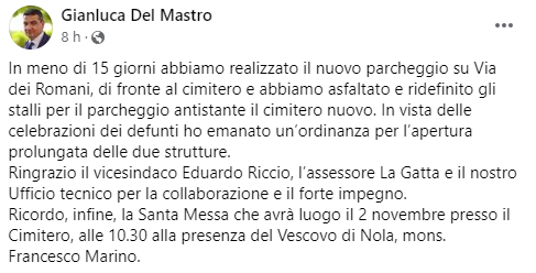 Questo il post pubblicato sulla sua pagina Facebook dal Sindaco di Pomigliano d'Arco Gianluca Del Mastro: "In meno di 15 giorni abbiamo realizzato il nuovo parcheggio su Via dei Romani, di fronte al cimitero e abbiamo asfaltato e ridefinito gli stalli per il parcheggio antistante il cimitero nuovo. In vista delle celebrazioni dei defunti - si legge nel post - ho emanato un’ordinanza per l’apertura prolungata delle due strutture. Ringrazio il vicesindaco Eduardo Riccio, l’assessore La Gatta e il nostro Ufficio tecnico per la collaborazione e il forte impegno. Ricordo - conclude il post - infine, la Santa Messa che avrà luogo il 2 novembre presso il Cimitero, alle 10.30 alla presenza del Vescovo di Nola, mons. Francesco Marino".