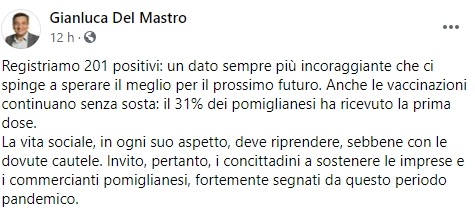 Questo il post pubblicato sulla sua pagina Facebook dal Sindaco di Pomigliano d'Arco Gianluca Del Mastro: "Registriamo 201 positivi: un dato sempre più incoraggiante che ci spinge a sperare il meglio per il prossimo futuro. Anche le vaccinazioni - si legge nel post - continuano senza sosta: il 31% dei pomiglianesi ha ricevuto la prima dose. La vita sociale, in ogni suo aspetto, deve riprendere, sebbene con le dovute cautele. Invito, pertanto, i concittadini - prosegue il post - a sostenere le imprese e i commercianti pomiglianesi, fortemente segnati da questo periodo pandemico".