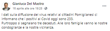 Questo il post pubblicato dal Sindaco di Pomigliano D'Arco Gianluca Del Mastro sulla sua pagina Facebook: "I dati sulla diffusione del virus relativi ai cittadini Pomiglianesi ci informano che i positivi al Covid oggi sono 233. Purtroppo - si legge nel post - si segnalano tre deceduti. Alle loro famiglie vanno le nostre condoglianze e la nostra vicinanza".