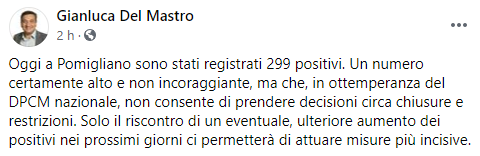 Questo il post pubblicato dal Sindaco di Pomigliano d'Arco Gianluca Del Mastro sulla sua pagina Facebook: "Oggi a Pomigliano sono stati registrati 299 positivi. Un numero certamente alto e non incoraggiante, ma che, in ottemperanza del DPCM nazionale, non consente - si legge nel post - di prendere decisioni circa chiusure e restrizioni. Solo il riscontro di un eventuale, ulteriore aumento dei positivi nei prossimi giorni ci permetterà di attuare misure più incisive".