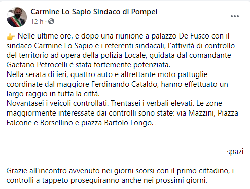 Questo parte del post pubblicato sulla sua pagina Facebook dal Sindaco di Pompei Carmine Lo Sapio: "Nelle ultime ore, e dopo una riunione a palazzo De Fusco con il sindaco Carmine Lo Sapio e i referenti sindacali, l’attività di controllo del territorio ad opera della polizia Locale, guidata dal comandante Gaetano Petrocelli è stata fortemente potenziata. Nella serata di ieri - si legge nel post - quattro auto e altrettante moto pattuglie coordinate dal maggiore Ferdinando Cataldo, hanno effettuato un largo raggio in tutta la città. Novantasei i veicoli controllati. Trentasei i verbali elevati. Le zone maggiormente interessate dai controlli - prosegue il post - sono state: via Mazzini, Piazza Falcone e Borsellino e piazza Bartolo Longo (...). Grazie all’incontro - si legge ancora nel post - avvenuto nei giorni scorsi con il primo cittadino, i controlli a tappeto proseguiranno anche nei prossimi giorni".
