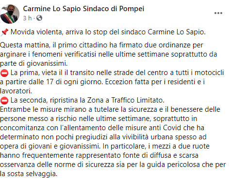 Questo parte del post pubblicato sulla sua pagina Facebook dal Sindaco di Pompei Carmine Lo Sapio: "Movida violenta, arriva lo stop del sindaco Carmine Lo Sapio. Questa mattina, il primo cittadino ha firmato due ordinanze per arginare i fenomeni verificatisi nelle ultime settimane soprattutto da parte di giovanissimi. La prima - si legge nel post - vieta il il transito nelle strade del centro a tutti i motocicli a partire dalle 17 di ogni giorno. Eccezion fatta per i residenti e i lavoratori. La seconda, ripristina la Zona a Traffico Limitato. Entrambe le misure mirano a tutelare la sicurezza e il benessere delle persone messo a rischio nelle ultime settimane, soprattutto in concomitanza con l’allentamento delle misure anti Covid che ha determinato non pochi pregiudizi alla vivibilità urbana - prosegue il post - spesso ad opera di giovani e giovanissimi. In particolare, i mezzi a due ruote hanno frequentemente rappresentato fonte di diffusa e scarsa osservanza delle norme di sicurezza sia per la guida pericolosa che per la sosta selvaggia".