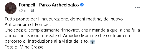 "Tutto pronto per l'inaugurazione, domani mattina, del nuovo Antiquarium di Pompei. Uno spazio, completamente rinnovato, che rimanda a quella che fu la prima concezione museale di Amedeo Maiuri e che costituirà un percorso di introduzione alla visita del sito."