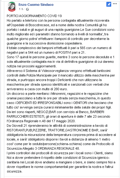 Ho parlato a telefono con la persona contagiata attualmente ricoverata all’Ospedale di Boscotrecase, ed a nome della nostra Comunità gli ho portato i saluti e gli auguri di una rapida guarigione.Le Sue condizioni sono molto migliorate ed i parametri stanno tornando a livelli di normalita’, tra qualche giorno potra’ effettuare i tamponi di controllo per decretarne la guarigione e la successiva dismissione ospedaliera. Il totale complessivo dei tamponi effettuati è pari a 565 con un numero di negativi pari a 544 ed un numero di POSITIVI pari a 21. Sono 17 quindi le persone guarite, mentre 3 sono le persone decedute e 1 sola attualmente contagiata ma in via di definitiva guarigione di cui daremo notizia nei prossimi aggiornamenti. Attraverso il Sistema di Videosorveglianza vengono effettuati tantissimi controlli dalla Polizia Municipale per il mancato utilizzo della mascherina per strada, e purtroppo ancora troppi i Deficienti che non utilizzano la mascherina per strada spesso identificati e sanzionati con verbali che arriveranno a casa con multe di 280 euro. Un discorso a parte meritano i Minorenni, ragazzini e le ragazzine che oramai pascolano a tutte le ore per strada senza mascherina, in questo caso i DEFICIENTI ED IRRESPONSABILI sono i GENITORI che lasciano che tutto cio' avvenga senza curarsi minimamente della salute dei propri figli. Da ieri sono riaperti, NEGOZI,BAR con servizio al Banco, BARBIERI PARRUCCHIERI ESTETISTI, gli orari di apertura è dalle 7 alle 23 secondo l’Ordinanza Regionale n.48 del 17 maggio 2020. Da Giovedì 21 riprenderanno le attività di somministrazione a tavolo di RISTORANTI,PUB,PIZZERIE, TRATTORIE,GASTRONOMIE E BAR, sarà’ obbligatoria la misurazione della temperatura corporea prima di accedere al locale, e sarà’ obbligatorio disporre i tavoli a distanza di almeno 1 metro cosi’ come per le sedute/persone(schiena-schiena) come da Protocollo di Sicurezza Allegato 3 ORDINANZA REGIONALE 48. I primi controllori dei protocolli di sicurezza per i locali sono i Clienti, siamo Noi a dover pretendere il rispetto delle condizioni di Sicurezza igienico-sanitaria nei Locali dove andiamo a mangiare o bere, e siamo sempre Noi a dover rispettare le norme comportamentali per garantire la nostra e l’altrui sicurezza."