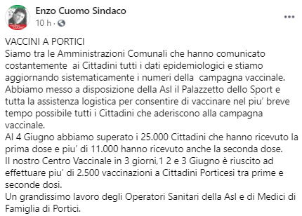 Questo parte del post pubblicato sulla sua pagina Facebook dal Sindaco di Portici Enzo Cuomo: "Vaccini a Portici. Siamo tra le Amministrazioni Comunali che hanno comunicato costantemente ai Cittadini tutti i dati epidemiologici e stiamo aggiornando sistematicamente i numeri della campagna vaccinale. Abbiamo messo a disposizione - si legge nel post - della Asl il Palazzetto dello Sport e tutta la assistenza logistica per consentire di vaccinare nel piu’ breve tempo possibile tutti i Cittadini che aderiscono alla campagna vaccinale. Al 4 Giugno abbiamo superato i 25.000 Cittadini - prosegue il post - che hanno ricevuto la prima dose e piu’ di 11.000 hanno ricevuto anche la seconda dose. Il nostro Centro Vaccinale in 3 giorni,1 2 e 3 Giugno è riuscito ad effettuare piu’ di 2.500 vaccinazioni a Cittadini Porticesi tra prime e seconde dosi. Un grandissimo lavoro - conclude il post - degli Operatori Sanitari della Asl e di Medici di Famiglia di Portici (...)".