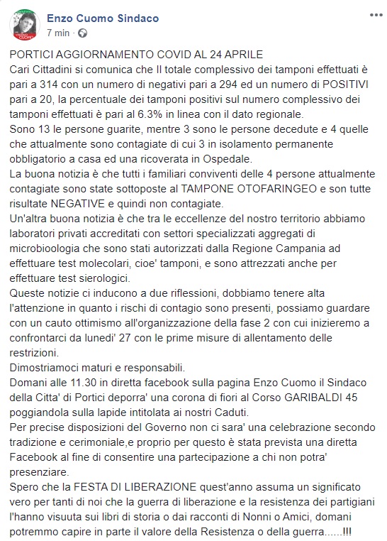 Questo quanto pubblicato sulla pagina facebook del Sindaco Cuomo: