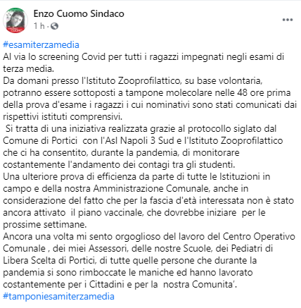 Questo il post pubblicato sulla sua pagina Facebook dal Sindaco di Portici Enzo Cuomo: "Al via lo screening Covid per tutti i ragazzi impegnati negli esami di terza media. Da domani presso l'Istituto Zooprofilattico, su base volontaria - si legge nel post - potranno essere sottoposti a tampone molecolare nelle 48 ore prima della prova d'esame i ragazzi i cui nominativi sono stati comunicati dai rispettivi istituti comprensivi. Si tratta di una iniziativa realizzata grazie al protocollo siglato dal Comune di Portici con l'Asl Napoli 3 Sud e l'Istituto Zooprofilattico che ci ha consentito - prosegue il post - durante la pandemia, di monitorare costantemente l'andamento dei contagi tra gli studenti. Una ulteriore prova di efficienza da parte di tutte le Istituzioni in campo e della nostra Amministrazione Comunale, anche in considerazione del fatto che - si legge ancora nel post - per la fascia d'età interessata non è stato ancora attivato il piano vaccinale, che dovrebbe iniziare per le prossime settimane. Ancora una volta mi sento orgoglioso del lavoro del Centro Operativo Comunale , dei miei Assessori, delle nostre Scuole, dei Pediatri di Libera Scelta di Portici, di tutte quelle persone - conclude il post - che durante la pandemia si sono rimboccate le maniche ed hanno lavorato costantemente per i Cittadini e per la nostra Comunita’".