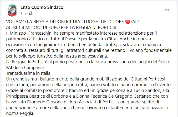 Questo quanto pubblicato sulla pagina fb del Sindaco di Portici