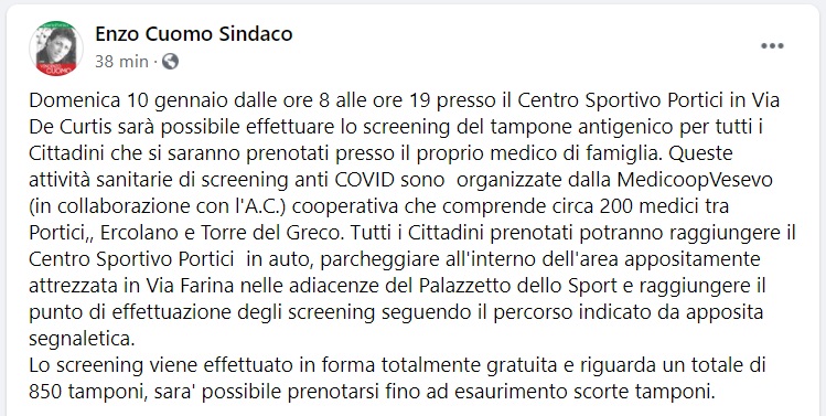 Questo quanto pubblicato sulla pagina fb del Sindaco di Portici