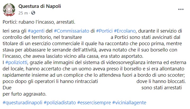 "Portici: rubano l’incasso, arrestati. Ieri sera gli #agenti del #Commissariato di #Portici #Ercolano, durante il servizio di controllo del territorio, nel transitare ... a Portici sono stati avvicinati dal titolare di un esercizio commerciale il quale ha raccontato che poco prima, mentre stava per abbassare le serrande dell’attività, aveva notato- si legge nella nota- che il suo borsello con l’incasso, che aveva lasciato vicino alla cassa, era stato asportato. I #poliziotti, grazie alle immagini del sistema di videosorveglianza interna ed esterna del locale, hanno accertato che un uomo aveva preso il borsello e si era allontanato rapidamente insieme ad un complice che lo attendeva fuori a bordo di uno scooter; poco dopo gli operatori li hanno rintracciati ... dove- si legge nella nota- li hanno bloccati. Due ... sono stati arrestati per furto aggravato."