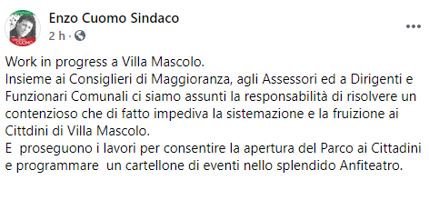 Questo parte del post pubblicato sulla sua pagina Facebook dal Sindaco di Portici Vincenzo Cuomo: "Work in progress a Villa Mascolo. Insieme ai Consiglieri di Maggioranza, agli Assessori ed a Dirigenti e Funzionari Comunali ci siamo assunti la responsabilità di risolvere un contenzioso che di fatto impediva la sistemazione e la fruizione ai Cittadini di Villa Mascolo. E proseguono - si legge ancora - i lavori per consentire la apertura del Parco ai Cittadini e programmare un cartellone di eventi nello splendido Anfiteatro (...)".