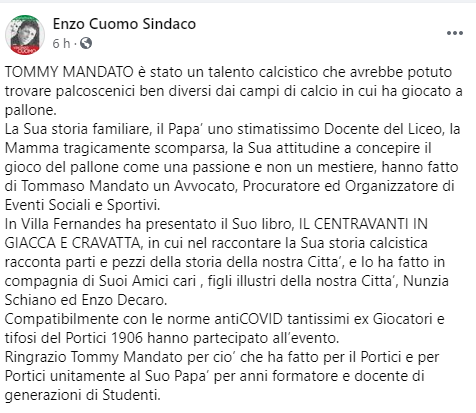 Questo il post pubblicato sulla sua pagina Facebook dal Sindaco di Portici Vincenzo Cuomo: "Tommy Mandato è stato un talento calcistico che avrebbe potuto trovare palcoscenici ben diversi dai campi di calcio in cui ha giocato a pallone. La Sua storia familiare, il Papa’ uno stimatissimo Docente del Liceo, la Mamma tragicamente scomparsa, la Sua attitudine a concepire il gioco del pallone - si legge nel post - come una passione e non un mestiere, hanno fatto di Tommaso Mandato un Avvocato, Procuratore ed Organizzatore di Eventi Sociali e Sportivi. In Villa Fernandes ha presentato il suo libro, 'Il centravanti in giacca e cravatta', in cui nel raccontare la Sua storia calcistica racconta parti e pezzi della storia della nostra Citta’, e lo ha fatto - si legge ancora - in compagnia di Suoi Amici cari, figli illustri della nostra Citta’, Nunzia Schiano ed Enzo Decaro. Compatibilmente con le norme antiCOVID tantissimi ex Giocatori e tifosi del Portici 1906 hanno partecipato all’evento. Ringrazio Tommy Mandato per cio’ che ha fatto per il Portici e per Portici - conclude il post - unitamente al Suo Papa’ per anni formatore e docente di generazioni di Studenti".