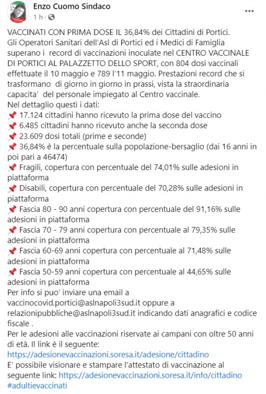"VACCINATI CON PRIMA DOSE IL 36,84% dei Cittadini di Portici. Gli Operatori Sanitari dell’Asl di Portici ed i Medici di Famiglia superano i record di vaccinazioni inoculate nel CENTRO VACCINALE DI PORTICI AL PALAZZETTO DELLO SPORT, con 804 dosi vaccinali effettuate il 10 maggio e 789 l’11 maggio. Prestazioni record che si trasformano di giorno in giorno in prassi, vista la straordinaria capacita’ del personale impiegato al Centro vaccinale. Nel dettaglio- si legge nella nota- questi i dati: 17.124 cittadini hanno ricevuto la prima dose del vaccino. 6.485 cittadini hanno ricevuto anche la seconda dose. 23.609 dosi totali (prime e seconde). 36,84% è la percentuale sulla popolazione-bersaglio (dai 16 anni in poi pari a 46474). Fragili, copertura con percentuale del 74,01% sulle adesioni in piattaforma. Disabili, copertura con percentuale del 70,28% sulle adesioni in piattaforma. Fascia 80 - 90 anni copertura con percentuale del 91,16% sulle adesioni in piattaforma. Fascia 70 - 79 anni copertura con percentuale al 79,35% sulle adesioni in piattaforma. Fascia 60-69 anni copertura con percentuale al 71,48% sulle adesioni in piattaforma. Fascia 50-59 anni copertura con percentuale al 44,65% sulle adesioni in piattaforma Per info si puo’ inviare una email a [email protected] oppure- si legge nella nota- a [email protected] indicando dati anagrafici e codice fiscale . Per le adesioni alle vaccinazioni riservate ai campani con oltre 50 anni di età. Il link è il seguente: https://adesionevaccinazioni.soresa.it/adesione/cittadino E' possibile visionare e stampare l'attestato di vaccinazione al seguente link: https://adesionevaccinazioni.soresa.it/info/cittadino #adultievaccinati"