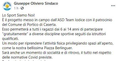 Questo parte del post pubblicato dal Sindaco di Portico di Caserta Giuseppe Oliviero sulla sua pagina Facebook: "Lo Sport Siamo Noi!