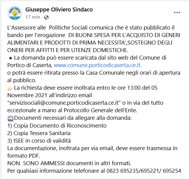 Questo il post pubblicato sulla pagina Facebook del sindaco di Portico di Caserta, Giuseppe Oliviero: "L'Assessore alle Politiche Sociali comunica che è stato pubblicato il bando per l'erogazione DI BUONI SPESA PER L’ACQUISTO DI GENERI ALIMENTARI E PRODOTTI DI PRIMA NECESSITA’,SOSTEGNO DEGLI ONERI PER AFFITTI E PER UTENZE DOMESTICHE. La domanda - si legge nel post - può essere scaricata dal sito web del Comune di Portico di Caserta, CLICCA QUI o potrà essere ritirata presso la Casa Comunale negli orari di apertura al pubblico. La richiesta deve essere inoltrata entro le ore 13:00 del 05 Novembre 2021 all'indirizzo email "[email protected]" o in via del tutto eccezionale - continua - a mano al Protocollo Generale dell'Ente. Documenti necessari da allegare alla domanda: 1) Copia Documento di Riconoscimento; 2) Copia Tessera Sanitaria; 3) ISEE in corso di validità; La documentazione, inoltrata per via email, deve essere trasmessa in formato PDF. NON SONO AMMESSI documenti in altri formati. Per qualsiasi informazione telefonare al 0823 695235/695221/ 695254".