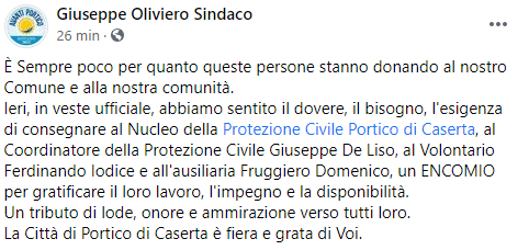 Questo il post pubblicato sulla sua pagina Facebook dal Sindaco di Portico di Caserta Giuseppe Oliviero: "È Sempre poco per quanto queste persone stanno donando al nostro Comune e alla nostra comunità. Ieri, in veste ufficiale, abbiamo sentito il dovere, il bisogno, l'esigenza - si legge nel post - di consegnare al Nucleo della Protezione Civile di Portico di Caserta al Coordinatore della Protezione Civile Giuseppe De Liso, al Volontario Ferdinando Iodice e all'ausiliaria Fruggiero Domenico, un encomio per gratificare il loro lavoro, l'impegno e la disponibilità. Un tributo di lode - si legge ancora - onore e ammirazione verso tutti loro. La Città di Portico di Caserta è fiera e grata di Voi".