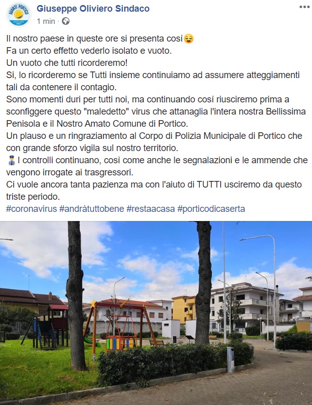 Portico di Caserta. CORONAVIRUS. Il Sindaco: "Con l'aiuto di tutti usciremo da questo triste periodo"