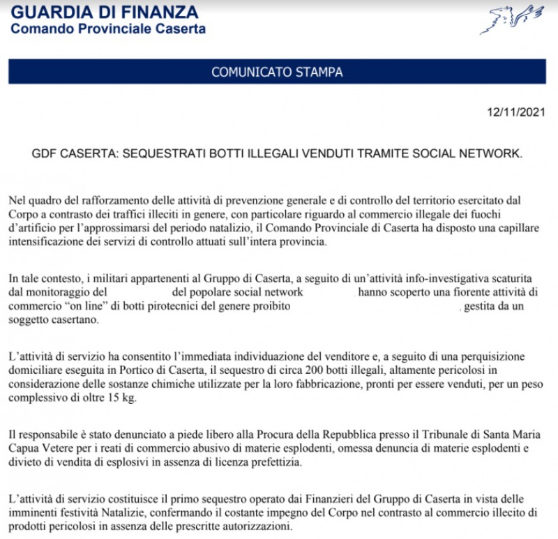 Nel quadro del rafforzamento delle attività di prevenzione generale e di controllo del territorio esercitato dal Corpo a contrasto dei traffici illeciti in genere, con particolare riguardo al commercio illegale dei fuochi d’artificio per l’approssimarsi del periodo natalizio, il Comando Provinciale di Caserta ha disposto una capillare intensificazione dei servizi di controllo attuati sull’intera provincia. In tale contesto - si legge nella nota -, i militari appartenenti al Gruppo di Caserta, a seguito di un’attività info-investigativa scaturita dal monitoraggio del ... del popolare social network ..., hanno scoperto una fiorente attività di commercio “on line” di botti pirotecnici del genere proibito ..., gestita da un soggetto casertano. L’attività di servizio ha consentito l’immediata individuazione del venditore e, a seguito di una perquisizione domiciliare eseguita in Portico di Caserta, il sequestro di circa 200 botti illegali, altamente pericolosi in considerazione delle sostanze chimiche utilizzate per la loro fabbricazione, pronti per essere venduti, per un peso complessivo di oltre 15 kg. Il responsabile è stato denunciato a piede libero alla Procura della Repubblica presso il Tribunale di Santa Maria Capua Vetere per i reati di commercio abusivo di materie esplodenti, omessa denuncia di materie esplodenti e divieto di vendita di esplosivi in assenza di licenza prefettizia. L’attività di servizio costituisce il primo sequestro operato dai Finanzieri del Gruppo di Caserta - si legge nella nota - in vista delle imminenti festività Natalizie, confermando il costante impegno del Corpo nel contrasto al commercio illecito di prodotti pericolosi in assenza delle prescritte autorizzazioni."