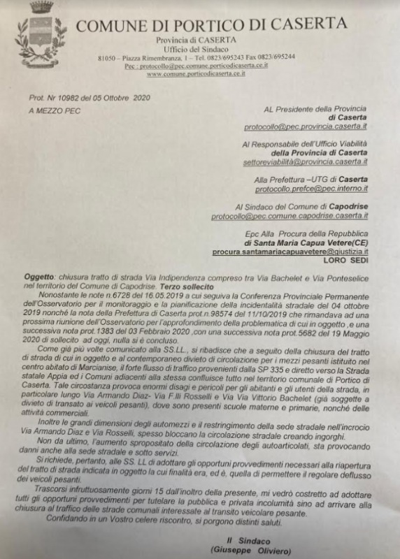 Pubblichiamo nota stampa del Comune di Portico di Caserta: "Non ci stancheremo fintanto gli Enti preposti non si attivino per aprire la Via Indipendenza al fine di permettere ai mezzi pensanti di circuire le strade interne evitando, quindi, di transitare all'interno del paese, con tutte le conseguenze negative che comportano. Diversi sono stati i solleciti e gli incontri effettuati - si legge nella nota -, ma ad oggi ancora nulla è stato fatto. Nonostante la nostra ultima missiva del 05.10.2020, indirizzata agli organi preposti nonché alla Procura della Repubblica, ad oggi nulla si è fatto. Pertanto così come preannunciato nella stessa, insieme alla mia squadra amministrativa con il supporto del personale della Locale Polizia Municipale comandata dal Col. Piricelli e della Protezione Civile, da domani mattina saremo nelle strade interessate, in particolare via Via Vittorio Bachelet e Via Diaz - si legge nella nota -, per bloccare tutti i tir che fanno accesso nella nostra città di Portico di Caserta. Magari, creando confusione e disagi, qualche istituzione si farà sentire. Il bene della nostra comunità prima di tutto."