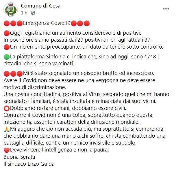 Questo quanto pubblicato sulla pagina facebook del Comune di Cesa: "Emergenza Covid19 Oggi registriamo un aumento considerevole di positivi. In poche ore siamo passati dai 29 positivi di ieri agli attuali 37. Un incremento preoccupante - si legge nella nota -, un dato da tenere sotto controllo. La piattaforma Sinfonia ci indica che, sino ad oggi, sono 1718 i cittadini che si sono vaccinati. Mi è stato segnalato un episodio brutto ed increscioso. Avere il Covid non deve essere ne una vergogna ne deve essere motivo di discriminazione. Una nostra concittadina, positiva al Virus - si legge nella nota -, secondo quel che mi hanno segnalato i familiari, è stata insultata e minacciata dai suoi vicini. Dobbiamo restare umani, dobbiamo essere civili. Contrarre il Covid non è una colpa, soprattutto quando questa infezione ha assunto i caratteri della diffusione mondiale. Mi auguro che ciò non accada più, ma soprattutto si comprenda che dobbiamo dare una mano a chi soffre, chi sta combattendo una battaglia difficile, contro un nemico invisibile e subdolo. Deve vincere l'intelligenza e non la paura. Buona Serata Il sindaco Enzo Guida".