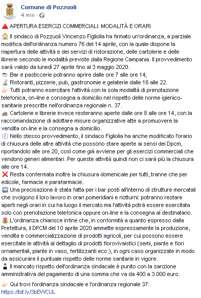 "APERTURA ESERCIZI COMMERCIALI: MODALITÀ E ORARI Il sindaco di Pozzuoli Vincenzo Figliolia ha firmato un'ordinanza, a parziale modifica dell'ordinanza numero 76 del 14 aprile, con la quale dispone la riapertura delle attività e dei servizi di ristorazione, delle cartolerie e delle librerie secondo le modalità previste dalla Regione Campania. Il provvedimento sarà valido da lunedì 27 aprile fino al 3 maggio 2020. Bar e pasticcerie potranno aprire dalle ore 7 alle ore 14; Ristoranti, pizzerie, pub, gastronomie e gelaterie dalle 16 alle 22. Tutti potranno esercitare l'attività con la sola modalità di prenotazione telefonica, on-line e consegna a domicilio nel rispetto delle norme igienico-sanitarie prescritte nell'ordinanza regionale n. 37. Cartolerie e librerie invece resteranno aperte dalle ore 8 alle ore 14, con la raccomandazione di adottare misure organizzative atte a promuovere la vendita on-line e la consegna a domicilio. Nello stesso provvedimento, il sindaco Figliolia ha anche modificato l'orario di chiusura delle altre attività che possono stare aperte ai sensi dei Dpcm, riportandolo alle ore 20, così come già avviene per gli esercizi commerciali che vendono generi alimentari. Per queste attività quindi non ci sarà più la chiusura alle ore 14. Resta confermata inoltre la chiusura domenicale per tutti, tranne che per edicole, farmacie e parafarmacie. Una precisazione è stata fatta per i bar posti all'interno di strutture mercatali che svolgono il loro lavoro in orari pomeridiani e notturni: potranno restare aperti negli orari in cui ha luogo il mercato ma l'attività potrà essere esercitata solo con prenotazione telefonica oppure on-line e la consegna al destinatario. L'ordinanza chiarisce infine che, in conformità a quanto espresso dalla Prefettura, il DPCM del 10 aprile 2020 ammette espressamente la produzione, vendita e commercializzazione di prodotti agricoli, per cui possono essere esercitate le attività al dettaglio di prodotti florovivaistici (semi, piante e fiori ornamentali, piante in vaso, fertilizzanti ecc.), in ogni caso organizzate in modo da assicurare il puntuale rispetto delle norme sanitarie in vigore. Il mancato rispetto dell'ordinanza sindacale è punito con la sanzione amministrativa del pagamento di una somma che va da 400 a 3.000 euro. Qui trovi l'ordinanza sindacale e l'ordinanza regionale 37: https://bit.ly/3bEWCUL".