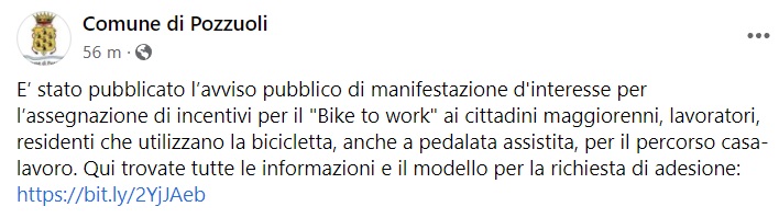 Questo quanto apprendiamo dalla pagina fb del Comune di Pozzuoli: "E’ stato pubblicato l’avviso pubblico di manifestazione d'interesse per l’assegnazione di incentivi per il "Bike to work" ai cittadini maggiorenni, lavoratori, residenti che utilizzano la bicicletta, anche a pedalata assistita, per il percorso casa-lavoro. Qui trovate tutte le informazioni e il modello per la richiesta di adesione: https://bit.ly/2YjJAeb".