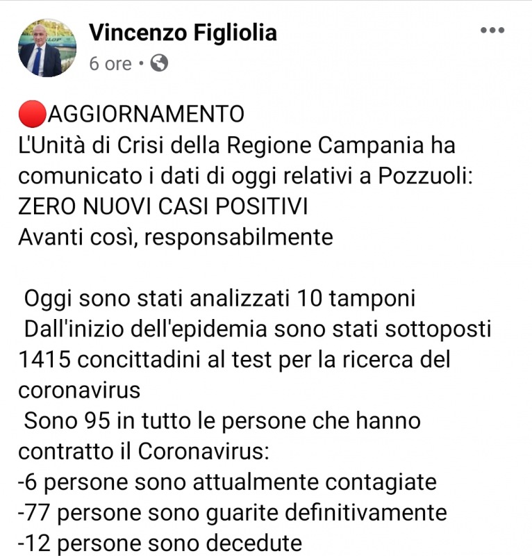 Lo apprendiamo dalla pagina Facebook del Sindaco di Pozzuoli, Vincenzo Figliolia: