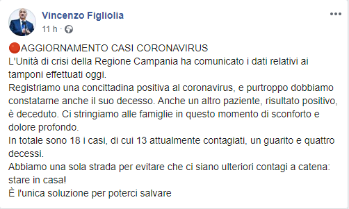 Registriamo una concittadina positiva al coronavirus, e purtroppo dobbiamo constatarne anche il suo decesso. Anche un altro paziente, risultato positivo, è deceduto. Ci stringiamo alle famiglie in questo momento di sconforto e dolore profondo. In totale sono 18 i casi, di cui 13 attualmente contagiati, un guarito e quattro decessi. Abbiamo una sola strada per evitare che ci siano ulteriori contagi a catena: stare in casa! È l'unica soluzione per poterci salvare".