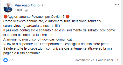 Come vi avevo annunciato, vi informerò sulla situazione sanitaria-coronavirus riguardante la nostra città. Il paziente contagiato è soltanto 1 ed è in isolamento da sabato, così come la catena di contatti a lui risalenti. Al momento non ci sono nuovi casi comunicati. Vi invito a rispettare tutti i comportamenti consigliati dal ministero per la Salute e tutte le disposizioni comunicate costantemente attraverso la mia pagina e il sito comunale".