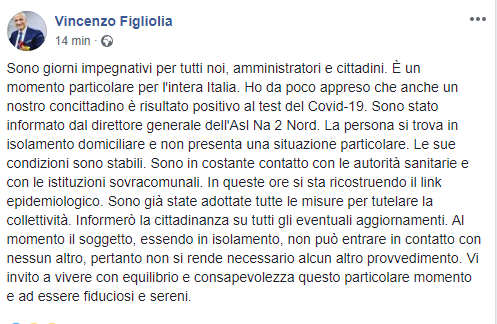 "Sono giorni impegnativi per tutti noi, amministratori e cittadini. È un momento particolare per l'intera Italia. Ho da poco appreso che anche un nostro concittadino è risultato positivo al test del Covid-19. Sono stato informato dal direttore generale dell'Asl Na 2 Nord. La persona si trova in isolamento domiciliare e non presenta una situazione particolare. Le sue condizioni sono stabili. Sono in costante contatto con le autorità sanitarie e con le istituzioni sovracomunali. In queste ore si sta ricostruendo il link epidemiologico. Sono già state adottate tutte le misure per tutelare la collettività. Informerò la cittadinanza su tutti gli eventuali aggiornamenti. Al momento il soggetto, essendo in isolamento, non può entrare in contatto con nessun altro, pertanto non si rende necessario alcun altro provvedimento. Vi invito a vivere con equilibrio e consapevolezza questo particolare momento e ad essere fiduciosi e sereni."