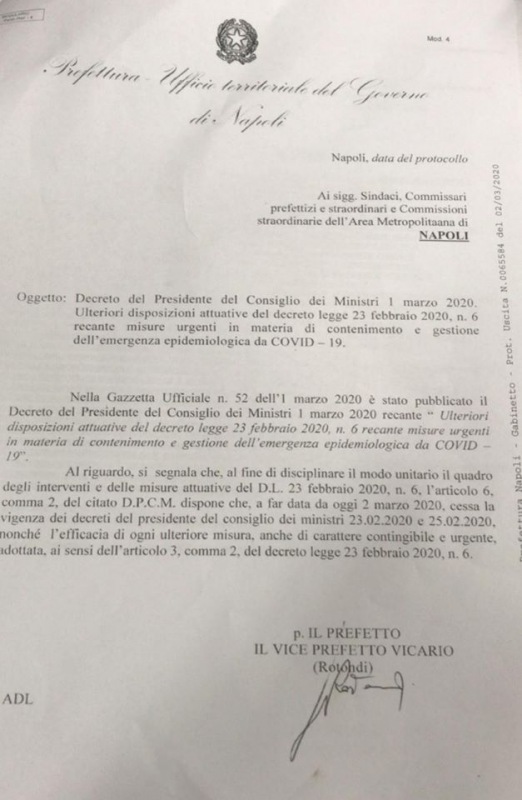 In data odierna la Prefettura ha comunicato con una nota formale allegata, che, in virtù del Decreto del Presidente del Consiglio dei Ministri del 1 marzo 2020, cessa l'efficacia di ogni misura adottata, anche se di carattere contingibile ed urgente, sul territorio nazionale. È prevalsa la necessità di disciplinare in modo unitario il quadro degli interventi e delle misure attuative del D.L 23 febbraio 2020 n. 6. È noto il rispetto istituzionale nei confronti degli Organi sovraordinati che caratterizza da sempre il mio operare di sindaco. Al di là delle posizioni dei singoli territorii ed al di là delle questioni giuridiche sottese, ritengo che debba prevalere la visione unitaria degli interventi, così come indicato a livello nazionale. Nel ringraziare tutti i cittadini per il comportamento avuto, auguro a tutto il mondo scolastico una ripresa delle attività orientata al contenuto del Decreto del Presidente del Consiglio dei Ministri. Allo stesso modo, auguro al mondo sportivo presenti sul territorio di riprendere le discipline sportive, invitando le strutture private a porre in essere la sanificazione dei locali ed una pulizia straordinaria degli stessi."
