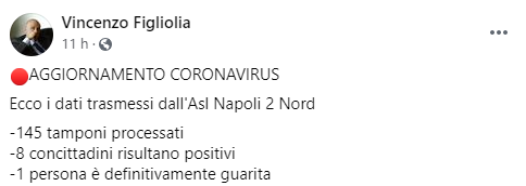 Questo il post pubblicato sulla sua pagina Facebook dal Sindaco di Pozzuoli Vincenzo Figliolia: "AGGIORNAMENTO CORONAVIRUS. Ecco i dati trasmessi dall'Asl Napoli 2 Nord -145 tamponi processati - si legge nel post - 8 concittadini risultano positivi -1 persona è definitivamente guarita".