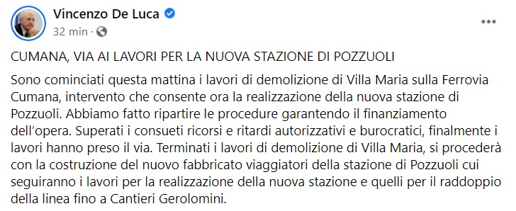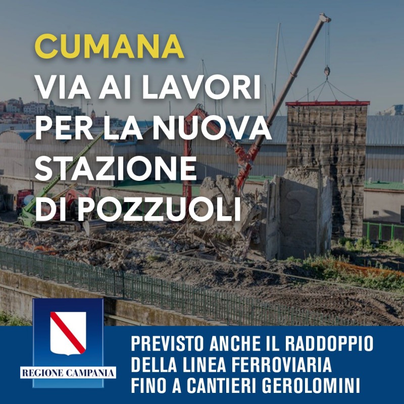 "Sono cominciati questa mattina i lavori di demolizione di Villa Maria sulla Ferrovia Cumana, intervento che consente ora la realizzazione della nuova stazione di Pozzuoli. Abbiamo fatto ripartire le procedure garantendo il finanziamento dell’opera. -Si legge nella nota- Superati i consueti ricorsi e ritardi autorizzativi e burocratici, finalmente i lavori hanno preso il via. -Si legge nella nota- Terminati i lavori di demolizione di Villa Maria, si procederà con la costruzione del nuovo fabbricato viaggiatori della stazione di Pozzuoli cui seguiranno i lavori per la realizzazione della nuova stazione e quelli per il raddoppio della linea fino a Cantieri Gerolomini."