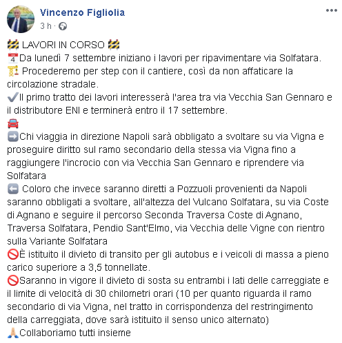 Lo apprendiamo dalla pagina Facebook del Sindaco di Pozzuoli, Vincenzo Figliolia.